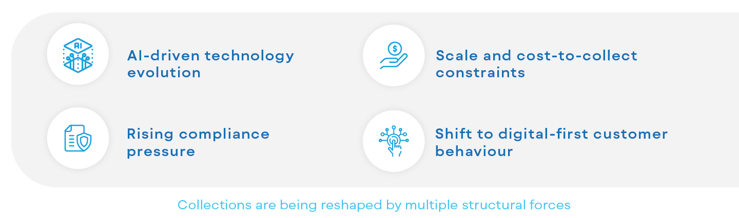 What hasn’t kept pace with these rising demands is the operating model. And yet, the mismatch between what collections organisations are being asked to deliver and what their operating models can realistically support is widening, driven by four powerful structural forces reshaping collections today.